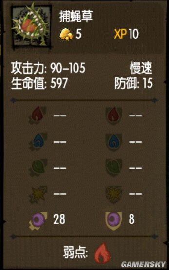 贪婪洞窟捕蝇草图鉴及属性介绍贪婪洞窟捕蝇草图鉴及属性介绍 捕蝇草是比较容易击杀的怪物 因为它的攻击频率非常慢 所以我们可以用它来刷经验 最好是带火属性攻击的武器 捕蝇草属性介绍 暗属性怪物 金币奖励 5 经验奖励 10 攻击力 90 ...