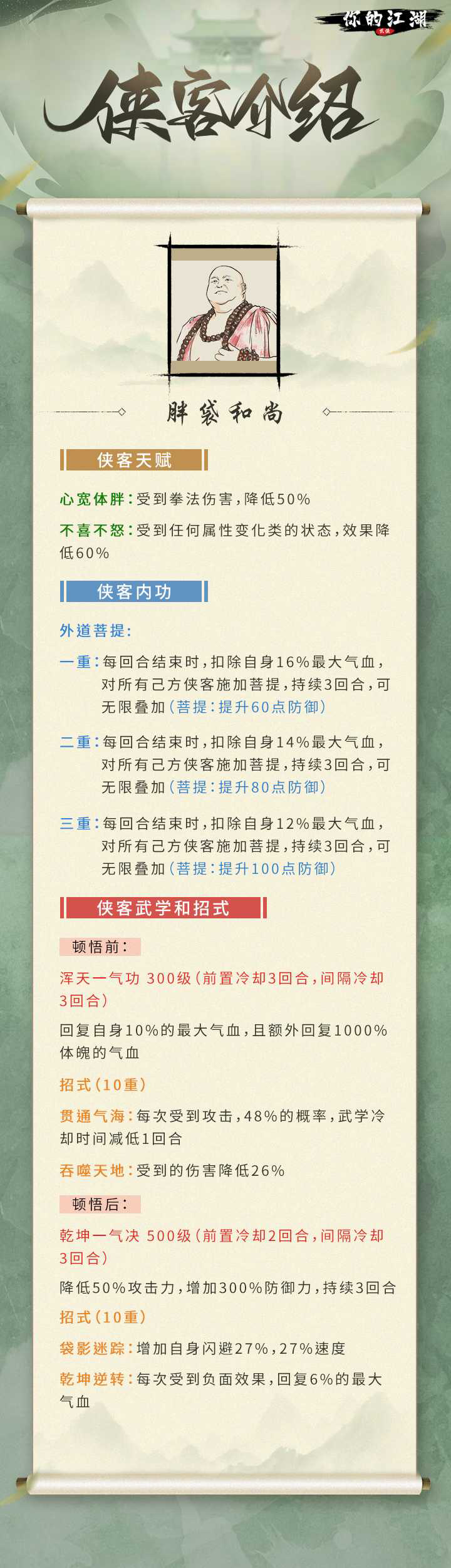你的江湖侠客信礼壹 - 明教散人——胖袋和尚[玩转游戏]你的江湖 侠客信礼壹 明教散人 胖袋和尚如下 明教五散人之一 随身携带乾坤一气袋 乃刀剑不破的天地间之异物 诗号 欢喜和尚 圆圆滚滚胖和尚 欢欢喜喜笑弥勒 天下万事人鬼神 说不得...