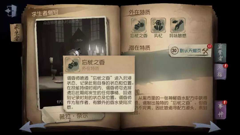 第五人格【攻略】1分钟学会调香师及加天赋![玩转游戏]第五人格 攻略 1 分钟学会调香师及加天赋 如下 转 能让游戏回档的女人 也将要加入庄园捣蛋大队伍中 一起来感受下调香师的魅力所在吧 调香师 Name 薇拉 奈尔 操纵着香水 利用...