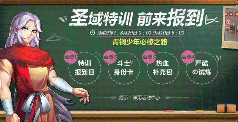 圣斗士星矢本周版本预告:青铜特训周圣斗士星矢 本周版本预告 青铜特训周如下 亲爱的圣斗士们 新的一周又开始了 本周圣域为各位斗士准备了大量新的游戏内容与活动内容 赶快来了解一下吧 版本内容更新 新玩法 军团争霸 报名时间 8 月 27...