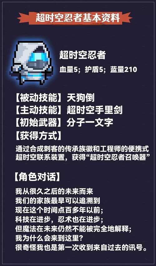 元气骑士超时空忍者解锁获得方法「超实用」元气骑士超时空忍者是春节版本中新上线的角色之一 因此很多玩家想知道元气骑士超时空忍者怎么解锁 元气骑士超时空忍者怎么获得 下面和游戏宝小编一起去了解一下吧 元气骑士超时空忍者怎么获得 1 刺客和...