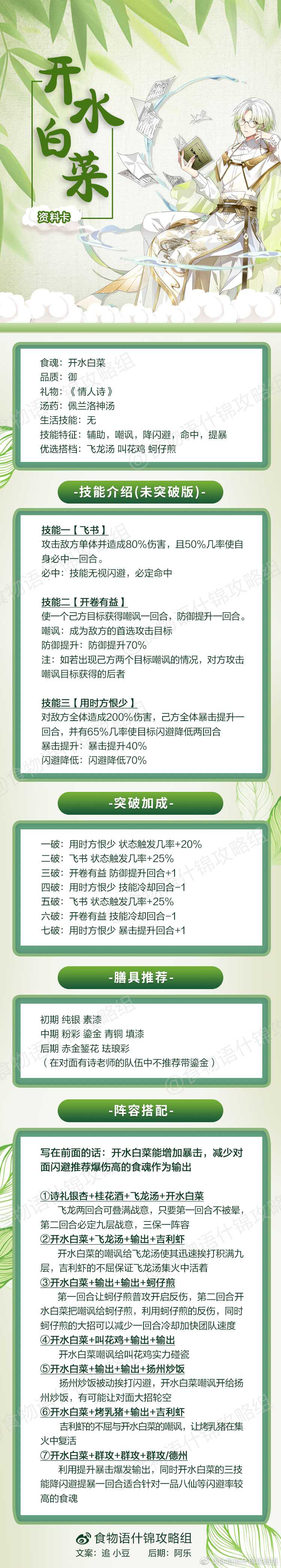 食物语开水白菜资料卡【什锦攻略组】[玩转游戏]食物语 开水白菜资料卡 什锦攻略组 如下 p1 新版 p2 旧版 技能重做后国文老师上场率大幅提高 大家久等啦 阵容搭配照旧为举例 目的是帮助大家理解白先生如何适用 以上就是食物语开水白菜...