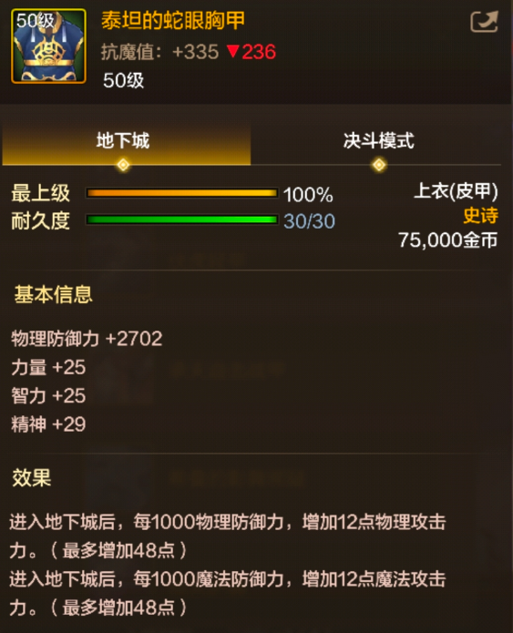《地下城与勇士起源》泰坦的蛇眼胸甲图鉴泰坦的蛇眼胸甲是 DNF 手游中的 50 级上衣位置的史诗皮甲散件 可以通过深渊掉落和近期开启的团队模式 BOSS 获取 那么接下来就让我们一起了解一下泰坦的蛇眼胸甲具体有着什么样的属性和效果吧 ...