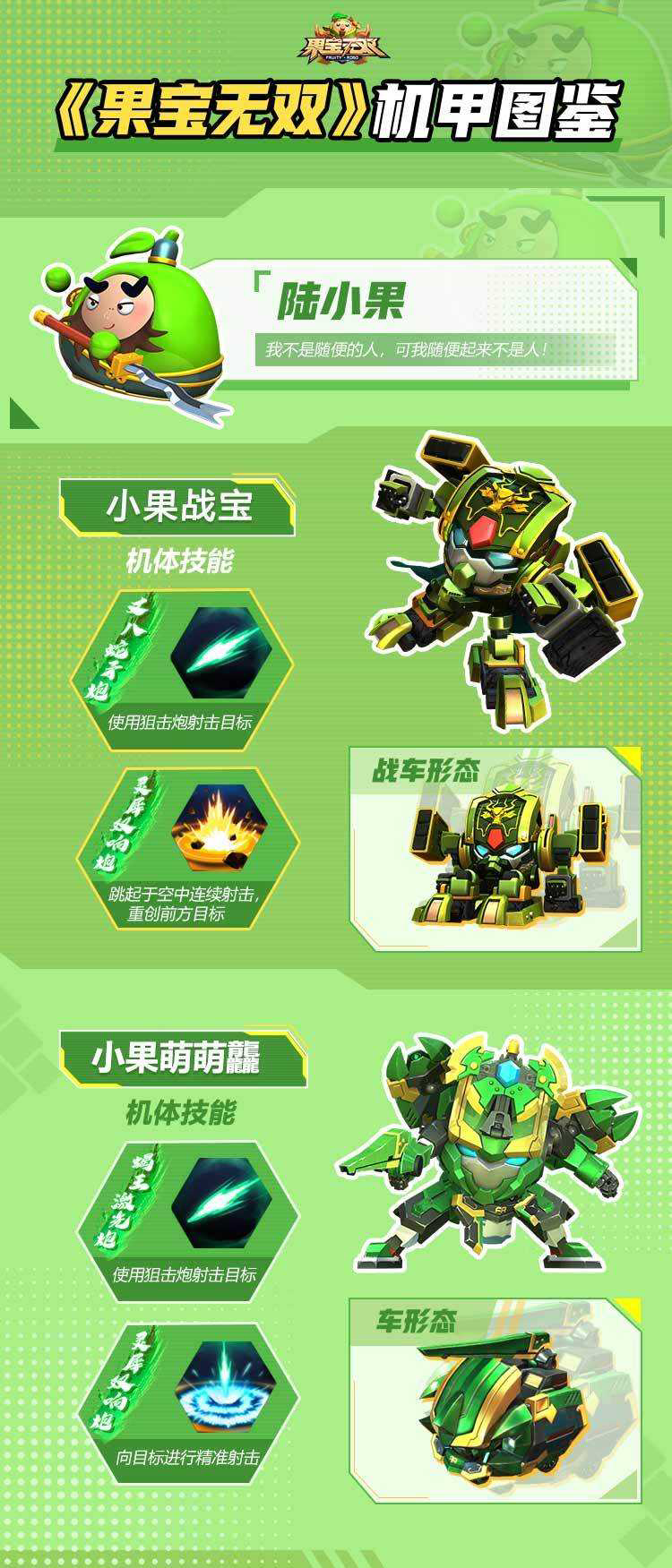果宝无双机甲图鉴-陆小果:我不是随便的人,可我随便起来不是人果宝无双 机甲图鉴 陆小果 我不是随便的人 可我随便起来不是人如下 大家好呀 果宝三剑客 最后一位果宝 陆小果的机甲情报来啦 V 果宝们记得预约游戏噢 期待早日见面 小果的小...