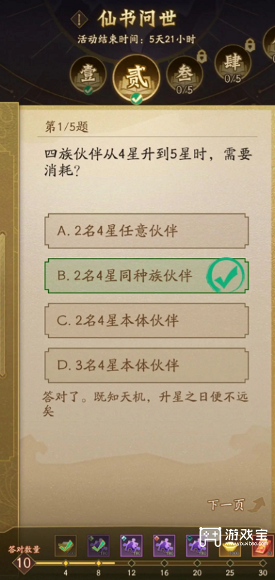 神仙道3仙书问世第二天答案[玩转游戏]神仙道 3 仙书问世第二天一共五个题目 玩家回答正确后即可领取 4 8 的累计奖励 游戏宝小编带来神仙道 3 仙书问世第二天答案 希望可以帮到大家 神仙道 3 仙书问世第二天答案 1 四族伙伴从 ...