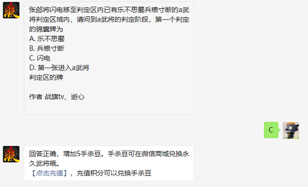 三国杀张郃将闪电移至判定区内已有乐不思蜀兵粮寸断的a武将判定区域内张郃将闪电移至判定区内已有乐不思蜀兵粮寸断的 a 武将判定区域内 请问到 a 武将的判定阶段 第一个判定的锦囊牌为 A 乐不思蜀 B 兵粮寸断 C 闪电 D 第一张进入...