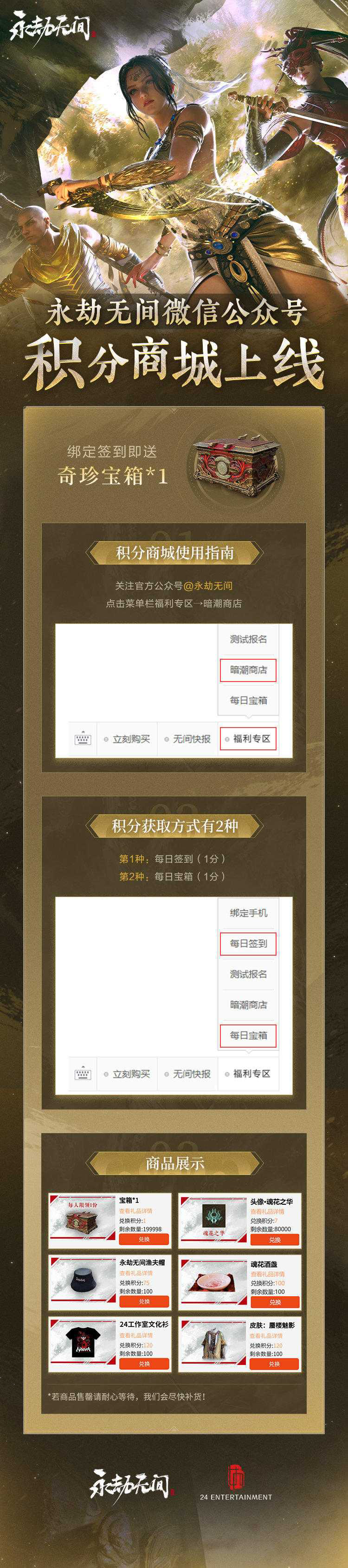永劫无间签到有礼!《永劫无间》微信公众号积分商城上线!「必看」永劫无间签到有礼 永劫无间 公众号积分商城上线 如下 永劫无间公众号积分商城今日上线 绑定签到即送奇珍宝箱 还有头像 魂花之华 金色皮肤以及多种精美周边奖励等你来拿 详情请...