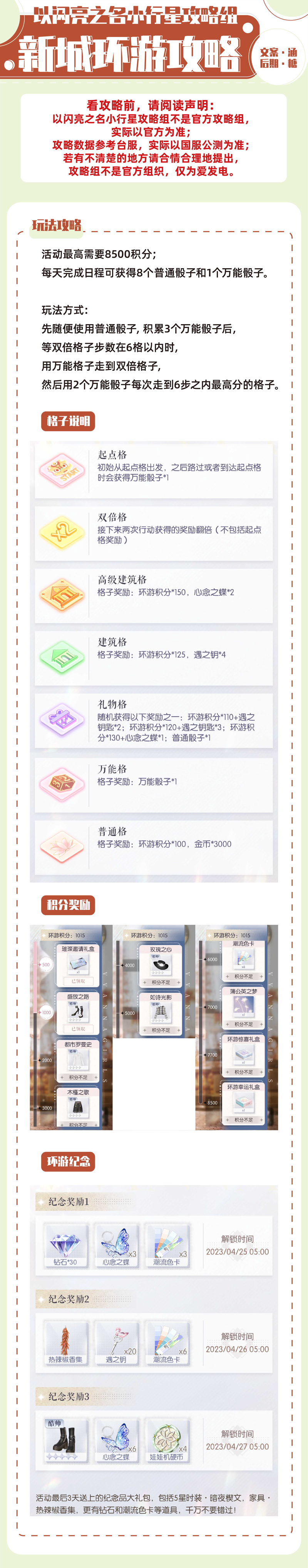 以闪亮之名新城环游攻略以闪亮之名 新城环 游攻略如下 活动最高需要 8500 积分 每天完成日程可获得 8 个普通骰子和 1 个万能骰子 玩法方式 先随便使用普通骰子 积累 3 个万能骰子后 等双倍格子步数在 6 格以内时 用万能格子...