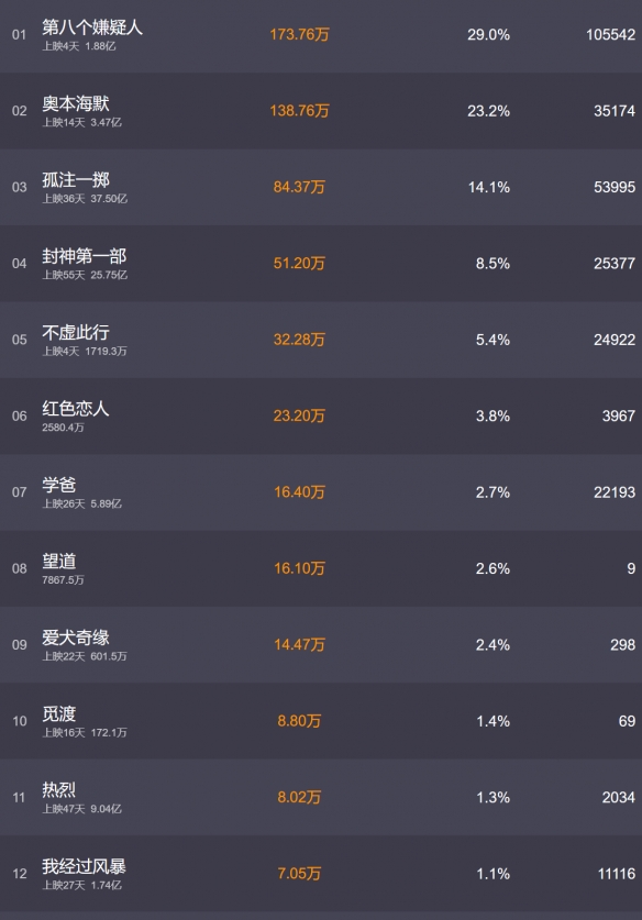 电影票房排行榜9月12日 9.12第八个嫌疑人等电影票房排行榜「超实用」9 月 12 日的电影票房情况怎么样 9 月 12 日是本周周一 也是电影 第八个嫌疑人 正式上映的第 3 天 同时 奥本海默 孤注一掷 依旧火热 那么接下来就让...
