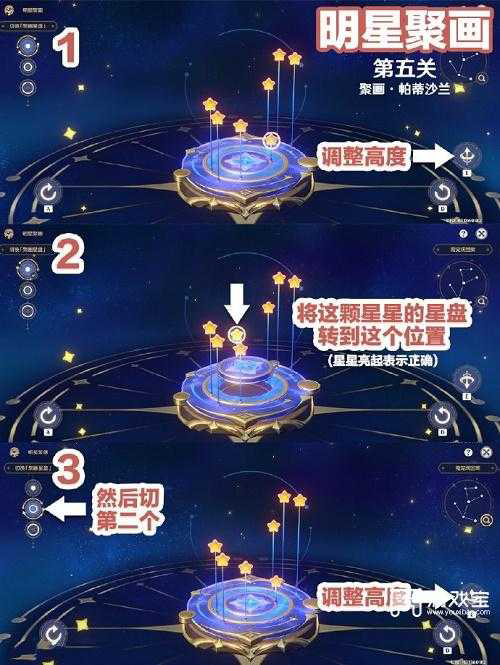 原神明星聚画第五关攻略原神明星聚画第五关中 玩家需要通过转动聚画星盘或者调整聚画星盘的高度 完成特定图案后才可以拿到奖励 游戏宝小编带来原神明星聚画第五关攻略 一起来看看吧 原神明星聚画第五关攻略 1 先调整高度 2 将这颗星星的星盘...