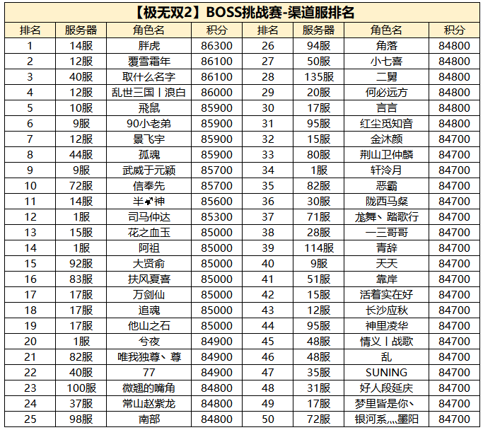 极无双2【排名公示】无双BOSS挑战赛排名公布[玩转游戏]极无双 2 排名公示 无双 BOSS 挑战赛排名公布如下 亲爱 的将军 感谢各位将军的参与和支持 本次 BOSS 挑战赛圆满结束 最终获奖排名如下 奖励将会在 11 月 22 ...