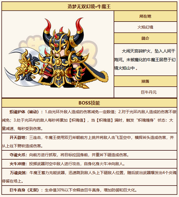 造梦无双幻境牛魔王技能表幻境牛魔王是造梦无双中非常强大的一个 boss 很多玩家都想要知道造梦无双幻境牛魔王技能是什么 游戏宝小编为大家带来造梦无双幻境牛魔王技能表 造梦无双幻境牛魔王技能表 1 炽魂护体 被动 由光环外敌人造成的伤害...
