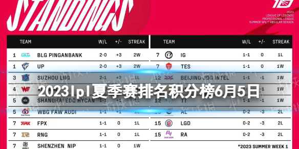 情况2023lpl夏季赛排名积分榜6月5日 lpl夏季赛排名情况6.5