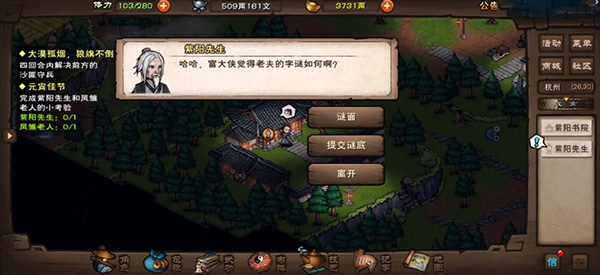 烟雨江湖凤雏老人灯谜答案一览烟雨江湖凤雏老人灯谜答案是什么 元宵活动需要回答凤雏老人的问题给出正确的灯谜才能获得奖励 游戏宝小编带来烟雨江湖凤雏老人灯谜答案一览 希望可以帮到大家 烟雨江湖凤雏老人灯谜答案一览 1 问题 四字谜 2 第...