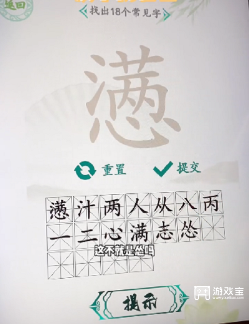 汉字找茬王懑找出18个字攻略汉字找茬王最新找字关卡里 需要玩家从懑上找出 18 个汉字后才可以过关 游戏宝小编带来汉字找茬王懑找出 18 个字攻略 希望可以帮到大家 汉字找茬王懑找出 18 个字攻略 1 懑 汁 两 人 从 八 丙 一...