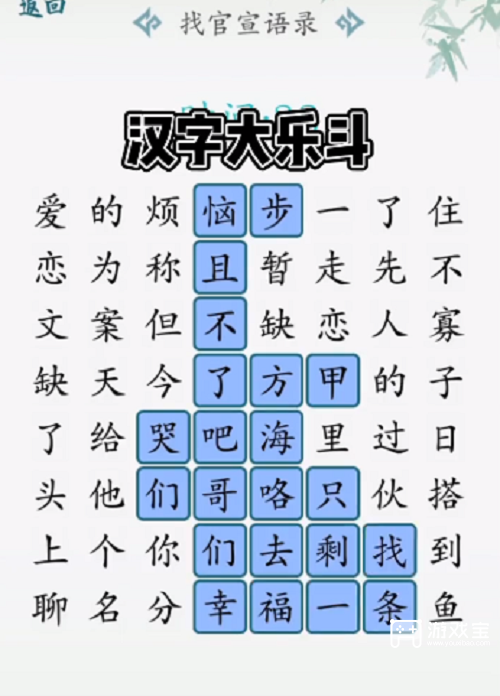 汉字大乐斗找官宣语录通关攻略汉字大乐斗找官宣语录关卡需要玩家根据下方的字连接成官宣语录即可过关 游戏宝小编带来汉字大乐斗找官宣语录通关攻略 一起来看看吧 汉字大乐斗找官宣语录通关攻略 1 月亮不会奔向你 但我会 不远万里的那种 2 你...