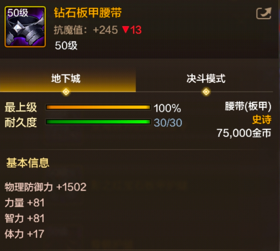 地下城与勇士起源钻石板甲腰带图鉴钻石板甲腰带是 DNF 手游中的 50 级腰带位置的史诗板甲散件 属性上提供了高额的力量和智力 能可以通过深渊掉落和团队模式 BOSS 获取 那么接下来就让我们一起了解一下钻石板甲腰带吧 DNF 手游钻...