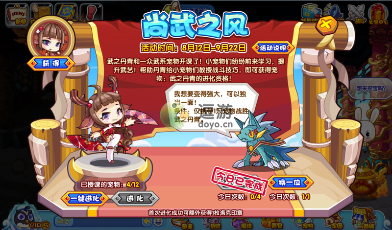 洛克王国尚武之风攻略详解洛克王国尚武之风活动怎么过 武之丹青和一众武系宠物开课了 小宠物们纷纷前来学习 提升武艺 下面就给大家详细讲解一下尚武之风活动玩法 洛克王国尚武之风攻略详解 1 开始授课 按照每位宠物提出的要求进行战斗 可能需...
