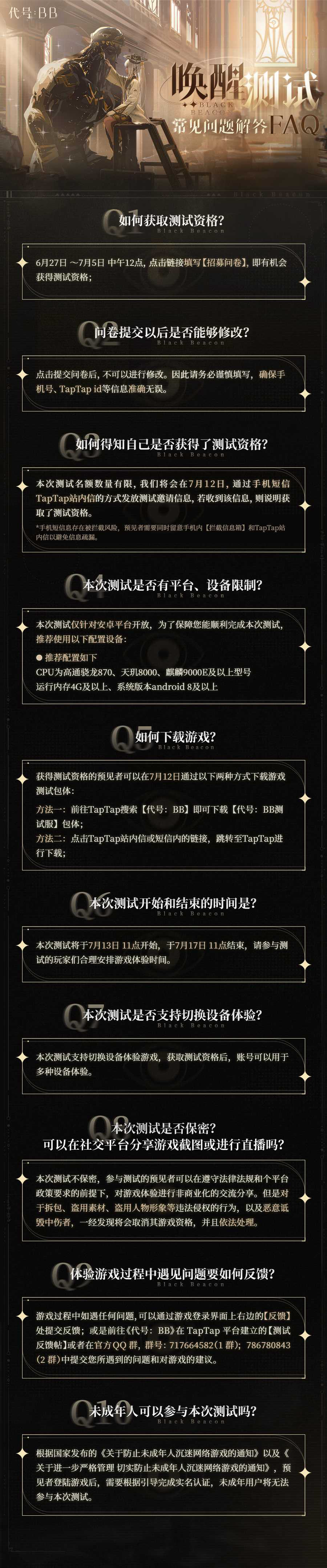 黑色信标《代号:BB》唤醒测试 - 常见问题一览「必看」黑 色信标 代号 BB 唤醒测试 常见问题一览如下 致预见者 代号 BB 唤醒测试现已开启招募 希望以下内容可以解答预见者的部分疑问 招募问卷参与测试招募 阅读原帖参与活动赢取周...