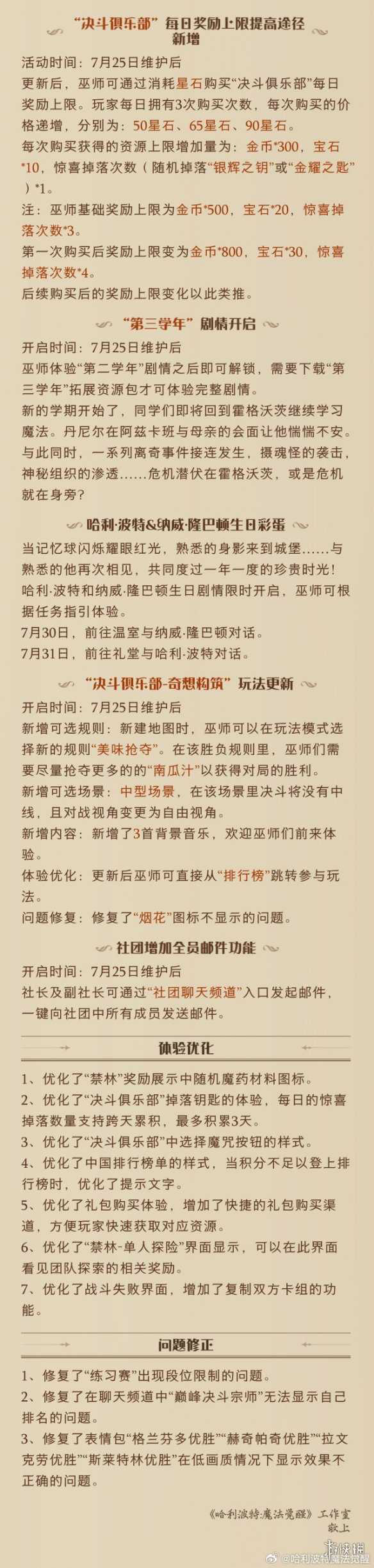 《哈利波特魔法觉醒》7月25日更新公告 7月25日更新了什么哈利波特魔法觉醒在 7 月 25 日进行了维护更新 许多小伙伴好奇这次更新了什么 下面小编就给大家带来了哈利波特魔法觉醒 7 月 25 日的更新公告 一起来看看吧 哈利波特魔...