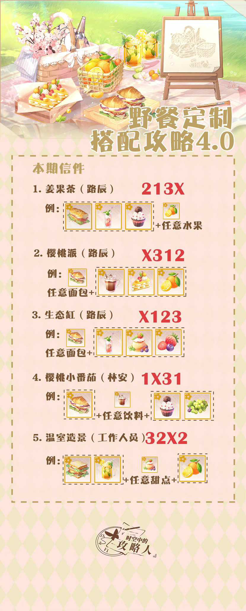 时空中的绘旅人野餐出行-信件攻略时空中的绘旅人 野餐出行 信件攻略如下 野餐出行 搭配攻略 水果烤着吃也别有一番风 味 野餐换着花样搭配组合也有不同的惊喜 路辰学长的樱桃烤小番茄想必已经做好啦 本期的野餐信件攻略也新鲜出炉 在肝新卡的...