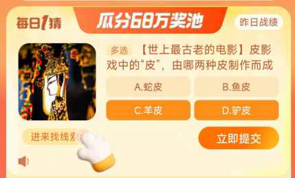 皮影戏中的皮由哪两种皮制作而成? 淘宝大赢家每日一猜答案10.20皮影戏中的 皮 由哪两种皮制作而成 这是淘宝大赢家每日一猜 10 月 20 日的问题 不少小伙伴想知道 10 月 20 日这道题目的答案是什么 接下来就让我们一起了解一...