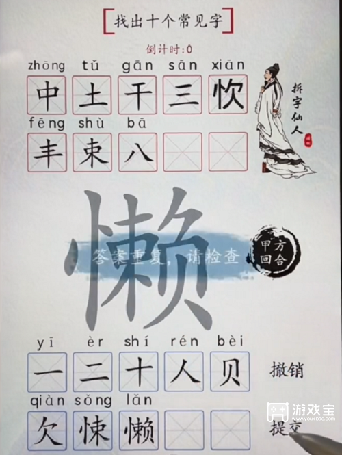 汉字达人懒找出10个字攻略「别错过」汉字达人找字关卡中 需要玩家从懒上面找出 10 个字后才可以过关 游戏宝小编带来汉字达人懒找出 10 个字攻略 希望可以帮到大家 汉字达人懒找出 10 个字攻略 1 一 二 十 人 贝 欠 悚 懒 ...