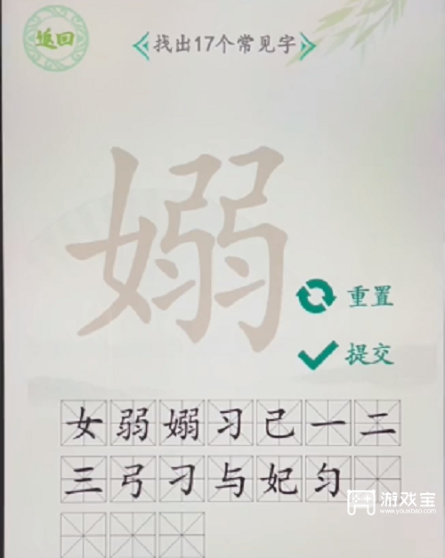 汉字找茬王嫋找出17个字攻略「必看」汉字找茬王最新找字关卡中 需要玩家从嫋上面找出 17 个汉字后才可以过关 游戏宝小编带来汉字找茬王嫋找出 17 个字攻略 一起来看看吧 汉字找茬王嫋找出 17 个字攻略 1 女 弱 嫋 习 己 一 ...