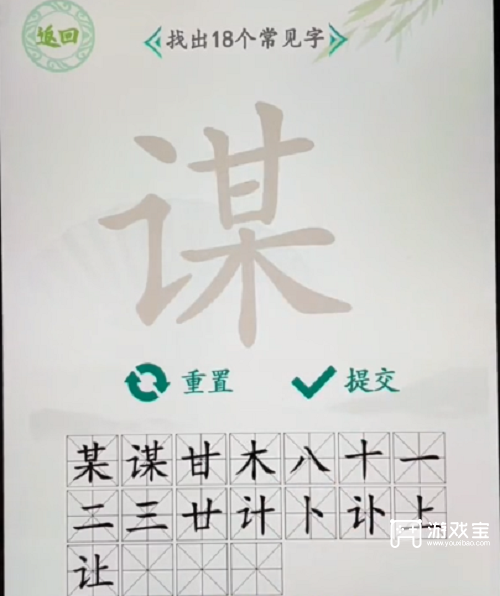 汉字找茬王谋找出18个字攻略汉字找茬王最新找字关卡需要从谋上面找出 18 个汉字后才可以过关 游戏宝小编带来汉字找茬王谋找出 18 个字攻略 希望可以帮到大家 汉字找茬王谋找出 18 个字攻略 1 某 谋 甘 木 八 十 一 二 三 ...