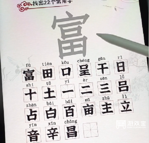 汉字派对富找出22个字攻略[亲测有效]汉字派对最新找字关卡中 需要玩家从富上面找出 22 个字后才可以过关 游戏宝小编带来汉字派对富找出 22 个字攻略 希望可以帮到大家 汉字派对富找出 22 个字攻略 1 富 田 口 呈 干 日 十...