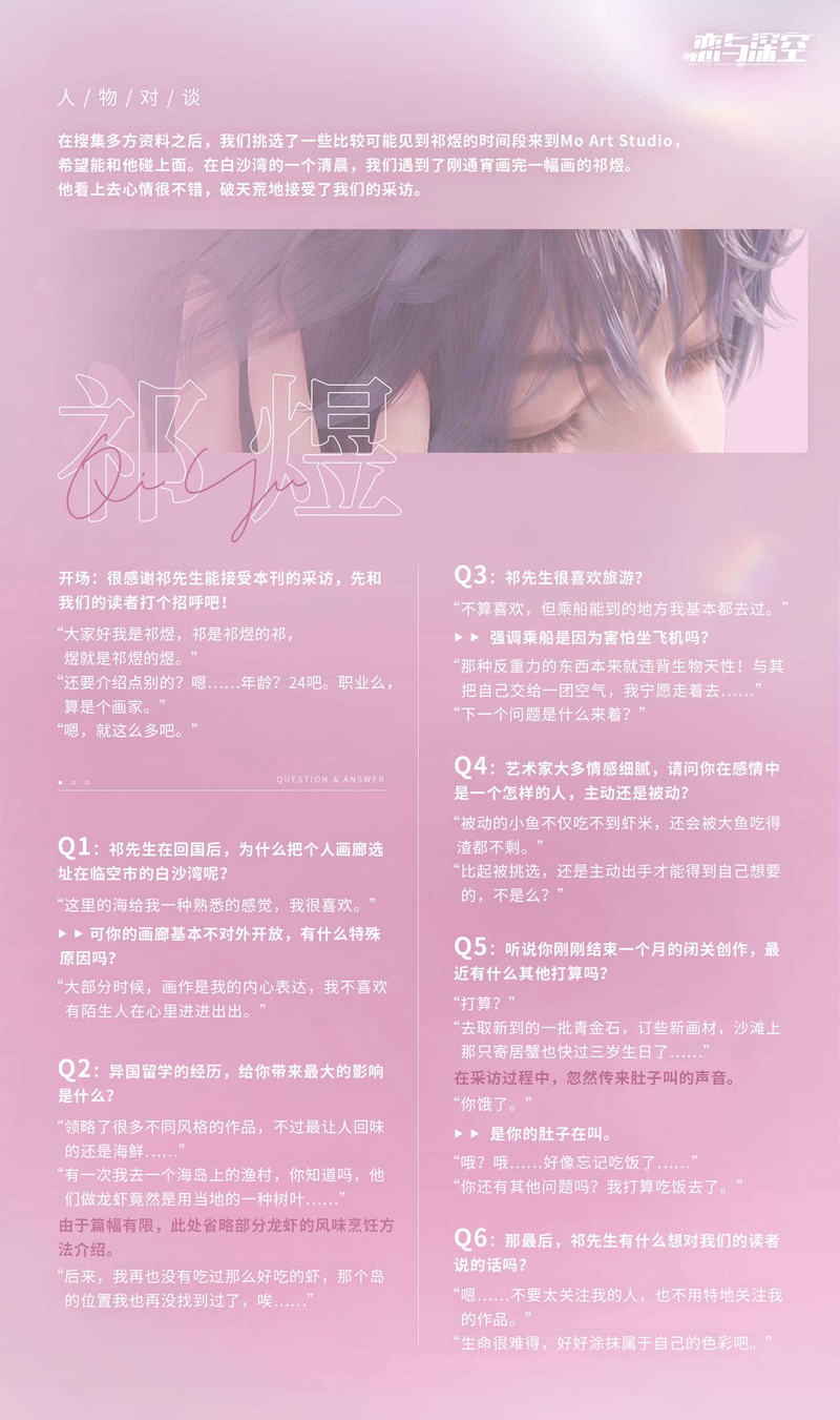 恋与深空「祁煜」人物对谈平面刊恋与深空 祁煜 人物对谈平面刊如下 归 国艺术家祁煜的作品风 格像烈火一样浪漫炽烈 看过的人都会对他画中的 利莫里亚 留下深刻的印象 他的个人画廊 Mo Art Studio 坐落在临空市的白沙湾 我们在...