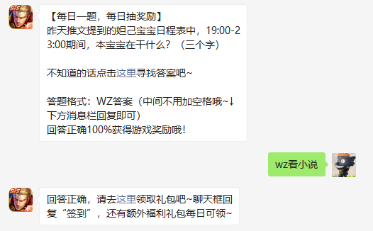 昨天推文提到的妲己宝宝日程表中19-00-23-00期间本宝宝在干什么三个字每日一题 每日抽奖励 昨天推文提到的妲己宝宝日程表中 19 00 23 00 期间 本宝宝在干什么 三个字 不知道的话这里寻找答案吧 答题格式 WZ 答案 中...