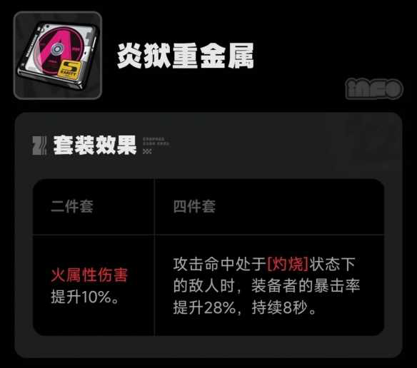绝区零炎狱重金属驱动盘搭配词条推荐[玩转游戏]炎狱重金属是绝区零中比较的火伤驱动盘 适合火属性角色来使用 那么炎狱重金属适合谁 推荐搭配什么副词条呢 接下来就让我们一起了解一下吧 绝区零炎狱重金属搭配推荐 1 套装效果 使用特定以太技...