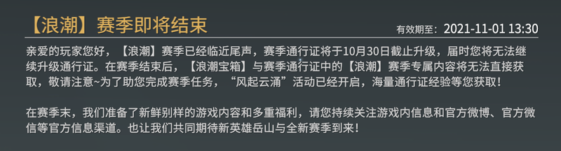 永劫无间永劫无间浪潮赛季倒计时四天提示[玩转游戏]永劫无间永劫无间浪潮赛季倒计时四天提示如下 各位英雄 好 赛季通行证将于 10 月 30 日截止升级 赛季结束后 浪潮宝箱 与赛季专属内容将无法直接获取 浪潮宝箱内的奖励即将绝版 为了...
