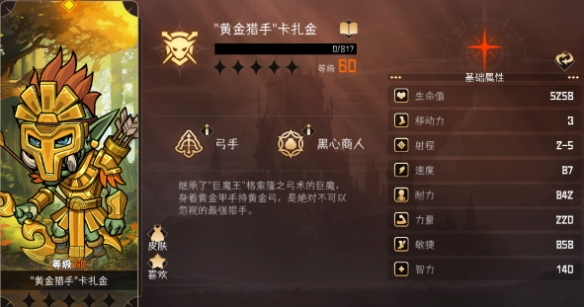 冒险寻宝然后打败卡扎金角色介绍在 冒险寻宝然后打败魔王 中 卡扎金继承了 巨魔王 格索隆之弓术的巨魔 身着黄金甲手持黄金弓 是绝对不可以忽视的最强猎手 卡扎金是身着一身黄金装备的射手 专属特质令他有概率在在攻击后获得金币 是非常实用的...