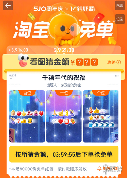 淘宝免单最后一场压轴题答案淘宝免单 5 月 9 日 21 点的问题现已公布 因为是本次活动最后一场的压轴题 所以最终的答案金额肯定不低 接下来小编将会给大家详细介绍千禧年代的祝福答案 感兴趣的千万别错过了 淘宝免单千禧年代的祝福答案是...