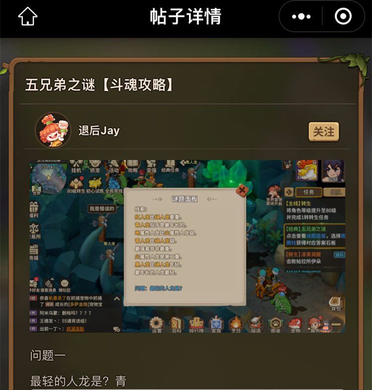 石器时代:觉醒石灰攻略集 - 【五兄弟之谜】通关答案「超实用」石器时代 觉醒 石灰攻略集 五兄弟之谜 通关答案如下 本期的优质攻略分享 来自 石器时代 觉醒 官方论坛 五 兄 弟 之 谜 作者 退后 Jay 最轻的人龙是 答案 青 水...