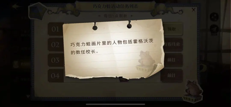 哈利波特-魔法觉醒【哈利波特】今日巧克力蛙npc地点 0927「别错过」哈利波特 魔法觉醒 哈利波特 今日巧克力蛙 npc 地点 0927 如下 今日巧克力蛙 NPC 麦格校长 巧克力蛙画片 里的人物包括霍格沃兹的数任校长 具体地点在...