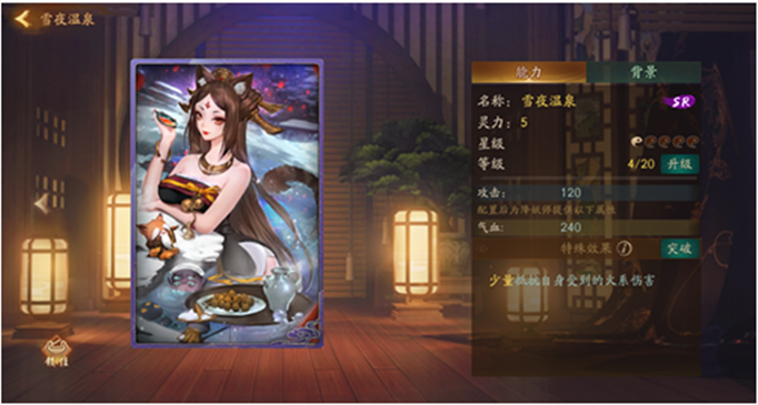 神都夜行录雪夜温泉怎么样?神都夜行录雪夜温泉怎么样 神都夜行录中拓印雪夜温泉的拓印效果为少量抵抗自身受到的火系伤害 拓印应该放在哪个妖灵身上才能有好的效果发挥呢 下面跟随小编来看看吧 雪夜温泉 稀有度 SR 升星前效果 少量抵抗自身受...