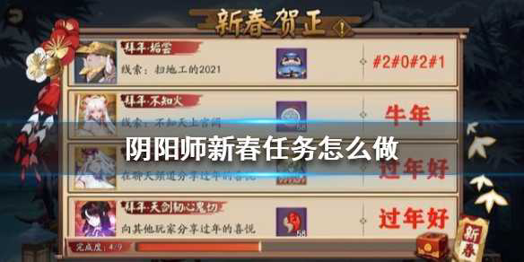 《阴阳师》新春任务怎么做 新春任务线索大全「超实用」阴阳师新春任务怎么做 小伙伴们都已经开始做新春任务了吗 这次的任务还是有几个线索任务需要玩家触发完成 那么这次的新春任务怎么完成呢 一起来看看吧 阴阳师新春任务怎么做 特殊任务 1 ...