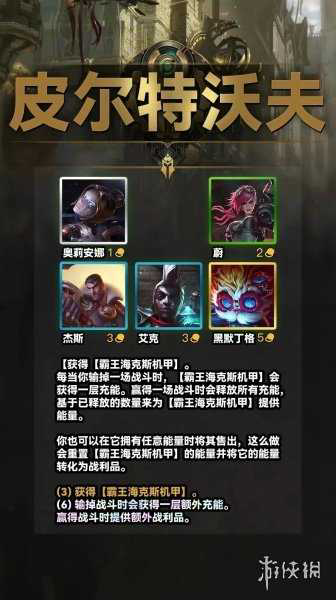 《云顶之弈手游》s9皮尔特沃夫羁绊介绍云顶之弈手游 s9 赛季中皮尔特沃夫羁绊的技能是霸王海克斯机甲 当该羁绊凑全时可以提供额外的一层充能效果 拥有战局失败获得的充能层数 那么以下就是皮尔特沃夫羁绊介绍 云顶之弈手游 s9 皮尔特沃夫...