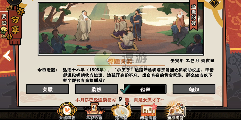 无悔华夏渔樵问答5.10答案一览无悔华夏渔樵问答 5 10 答案是什么 5 月 10 日渔樵问答问的是关于小王子达延汗与哪个部名有直接的联系 很多小伙伴可能都没听过这个名字 下面为大家科普一下 无悔华夏渔樵问答 5 10 答案一览 1...