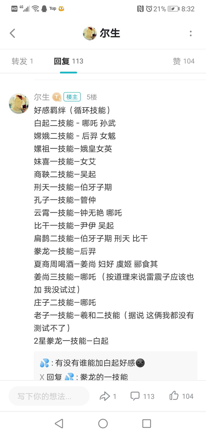无悔华夏自备攻略[玩转游戏]无悔华夏 自备攻略如下 民生 拜访 1 贤者 会盟 15 军事 打架 1 政治 用间 1 会盟 5 好感羁绊 下面贴图 白起二技能 范增 谈判 谈雄兵良将 诸侯咸服 娥皇 3489 云梦泽 90 威望 姜尚...