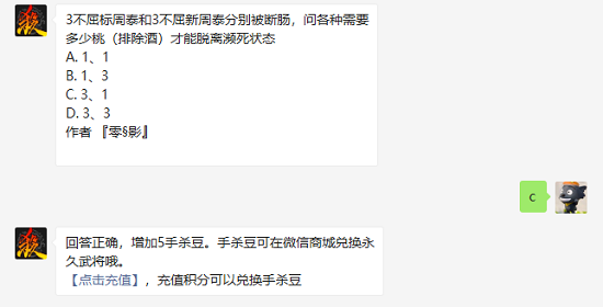 三国杀3不屈标周泰和3不屈新周泰分别被断肠问各种需要多少桃排除酒才能脱离3 不屈标周泰和 3 不屈新周泰分别被断肠 问各种需要多少桃 排除酒 才能脱离濒死状态 这是三国杀 11 月 2 日题目 因此很多玩家想知道正确答案是什么 游戏宝...