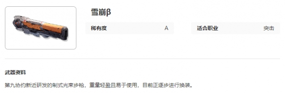 艾塔纪元雪崩β图鉴介绍「必看」艾塔纪元雪崩 图鉴介绍 第九协约新近研发的制式光束步枪 重量轻盈且易于使用 目前正逐步进行换装 下面小编给大家带来艾塔纪元雪崩 图鉴介绍 有需要的小伙伴一起来看看吧 攻略大全 艾塔纪元雪崩 图鉴介绍 一 ...