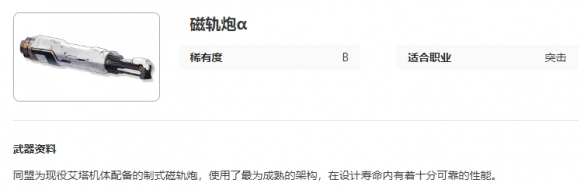 艾塔纪元磁轨炮α图鉴介绍艾塔纪元磁轨炮 图鉴介绍 同盟为现役艾塔机体配备的制式磁轨炮 使用了最为成熟的架构 在设计寿命内有着十分可靠的性能的武器 下面小编给大家带来艾塔纪元磁轨炮 图鉴介绍 有需要的小伙伴一起来看看吧 攻略大全 艾塔纪...