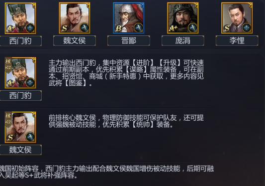 九州三国志魏国武将初级篇「超实用」九州三国 志魏国武将初级篇如下 推荐 甄姬 曹植 乐进 徐晃 张郃 主力 甄姬 实在不要太爽 一个石头砸全屏 集中资源 进阶 升级 可快速过度前期副本 积累 谋略 属性装备 以上就是九州三国志 魏国武...