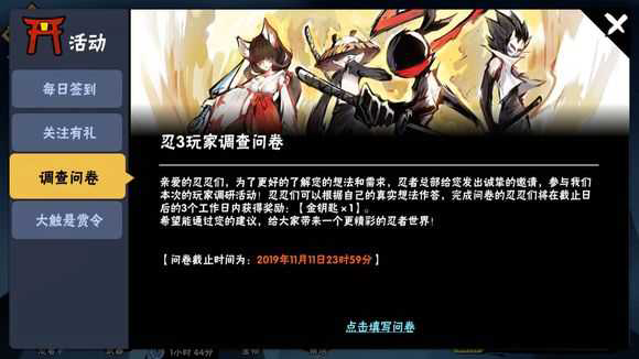 忍者必须死3双十一金钥匙礼包「别错过」忍者必须死 3 手游双十一金钥匙礼包在哪领 忍者必须死 3 在双十一也为大家带来了一个调查问卷的金钥匙福利 福利内容也是非常丰富 下面小编就带来了忍者必须死 3 手游双十一金钥匙礼包领取地址 还没...