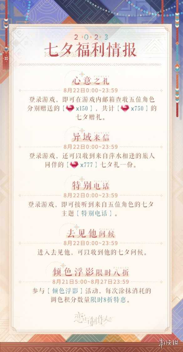 《恋与制作人》七夕活动2023 七夕福利一览七夕节到啦 恋与制作人为大家准备了许多七夕福利 许多小伙伴好奇具体都有哪些福利 下面小编就给大家带来了恋与制作人七夕活动介绍 一起来看看吧 恋与制作人七夕活动 2023 心意之礼 8 月 2...