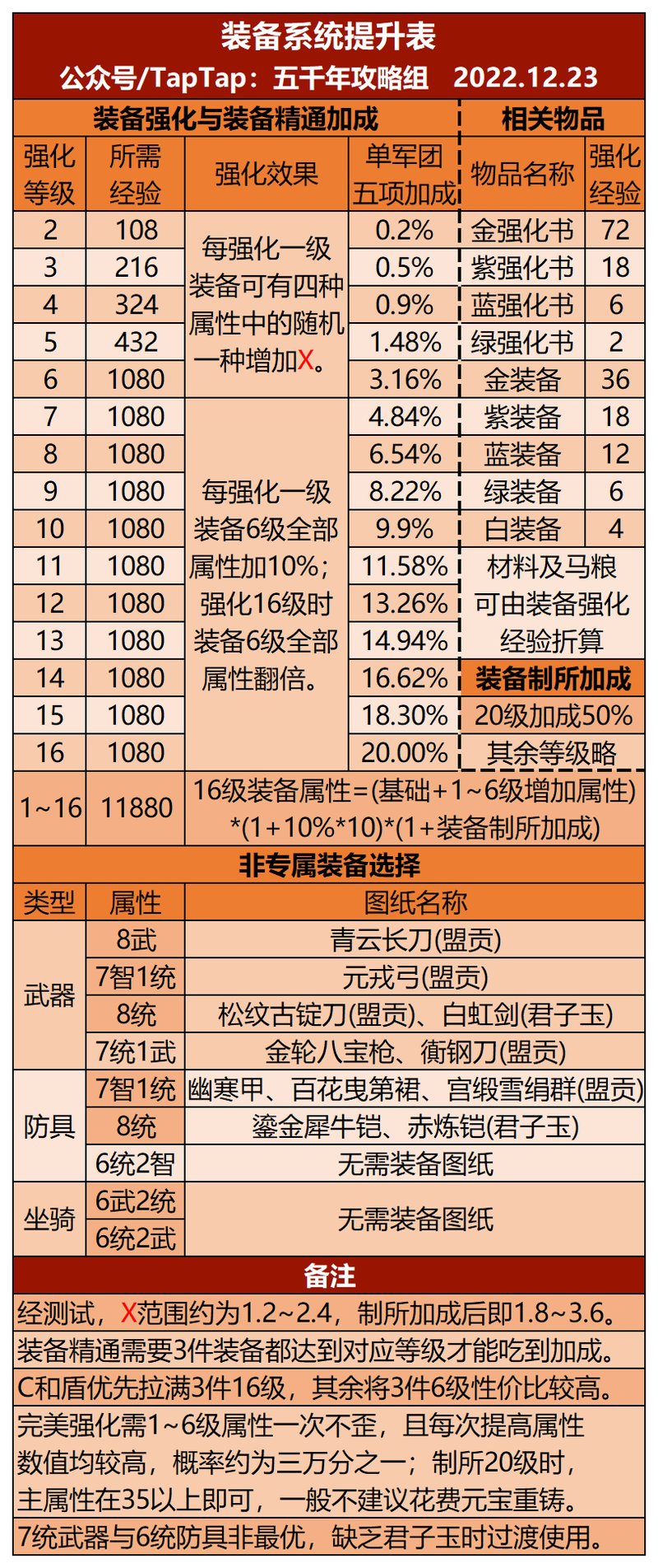 小小五千年五千年攻略组:装备系统养成「超实用」小小 五千 年五千年攻略组 装备系统养成如下 根据已有测试 单次 1 6 级强化获得的属性最高为 3 59 故取最大值为 3 6 16 级单属性装备理论最大属性为 60 欢迎各位玩家在本帖...